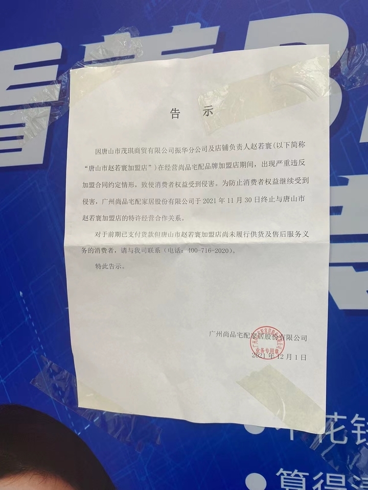 出现问题后,12月1日,尚品宅配总部曾于该门店前张贴了一份告示,上面写明因唐山市茂琪商贸有限公司振华分公司及店铺负责人在经营尚品宅配品牌加盟店期间严重违反加盟合同约定,致使消费者权益受到侵害,已于11月30日与该加盟商终止特许经营关系,未履行供货及售后服务义务的消费者可与总部联系,并附上了联系电话。