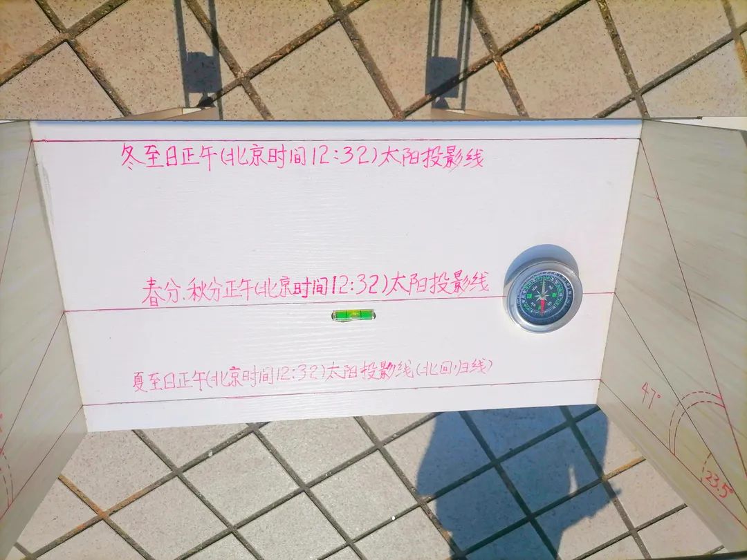为了使此次探究活动能够顺利开展,该校创客组成员和学生就探究活动的主题、时间、步骤等提前制定探究方案,师生们还一起完善了创新性的水平式观测仪器,提高探究活动的数据准确性,最终确定活动选择冬至日正午开展。