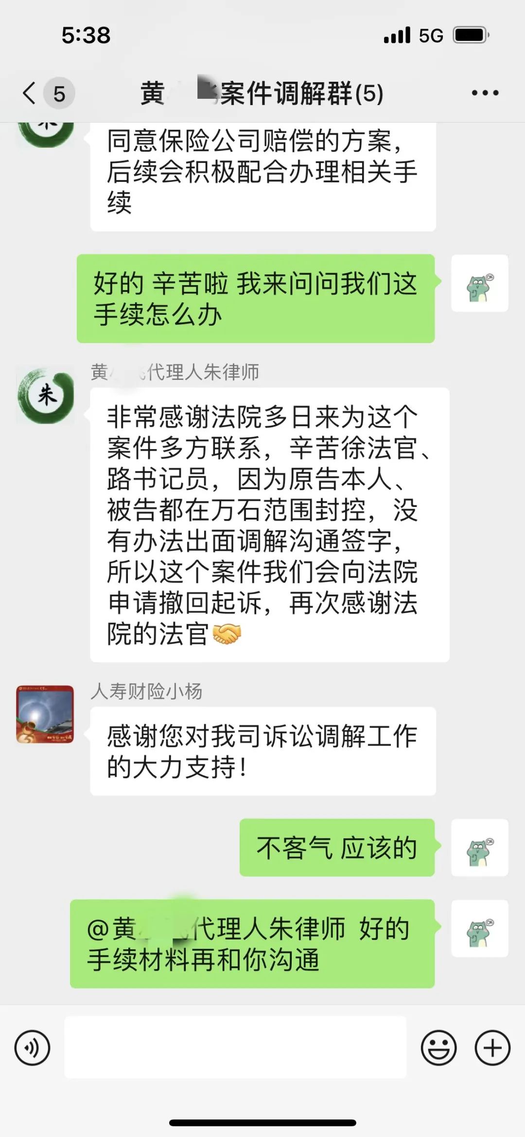 12月17日,宜兴法院道交庭人民调解员蒋和芳来到某保险公司,就一起交通事故纠纷进行调解。经她耐心细致的解释和劝导,当事人最终达成一致意见,原告获得近27万元的赔偿款,当场写下了撤诉申请。