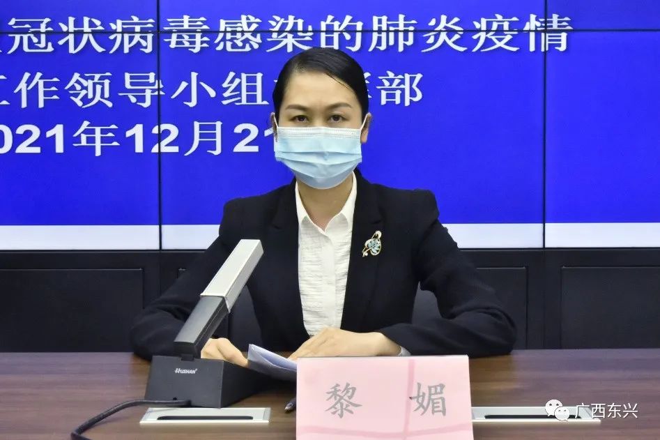 大家好!欢迎出席东兴市新冠肺炎疫情防控新闻发布会。12月20日晚,东兴市在例行核酸检测中发现1例新冠肺炎阳性感染者,引起社会广泛关注。为及时回应社会关切,我们邀请东兴市委副书记、市长李健,东兴市卫生健康局局长孙志科,介绍有关处置情况及我市最新的疫情防控工作措施,并回答记者提问。我是本场新闻发布会主持人,东兴市委常委、宣传部部长黎媚。