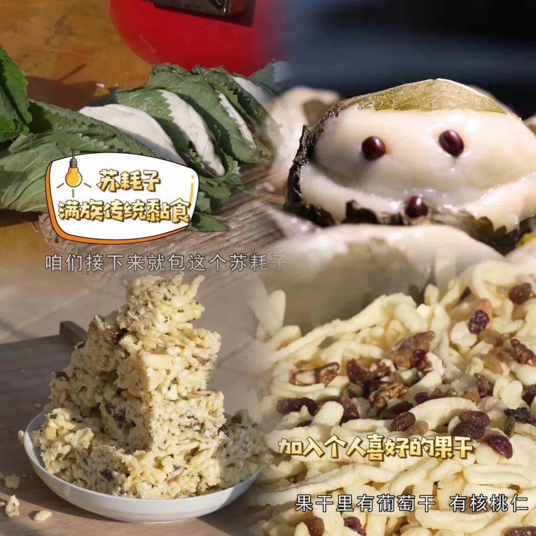 苏耗子,又称“苏子叶饽饽”,它用黏米面做皮,红小豆做馅包在其中,外用苏子叶包裹,因其形状像小老鼠的样子,所以取名“苏耗子”。它软糯香甜,Q弹劲道,既有红豆的甘甜,又有苏子叶的清香。