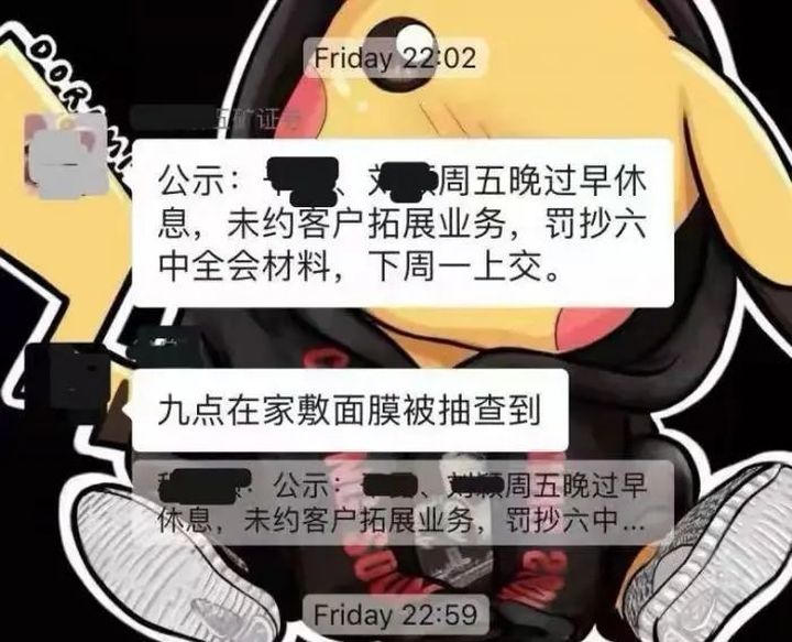 近日,五矿证券固定收益部两名员工因周五晚过早休息,未约客户拓展业务,被罚抄六中全会材料,其中一人的具体原因竟然是:“晚上9点在家敷面膜被抽查到,耽误加班。”