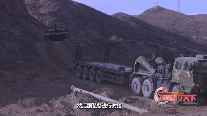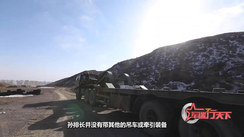 这辆“故障”坦克,被困在一个约十米高的土坡平台上。车长近19米的重装运输车没有办法完全开上去,只能通过在狭窄的斜坡上倒车,对坦克进行施救。