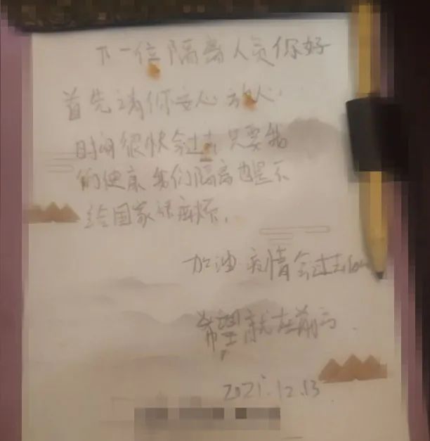 一名隔离对象在看到医护人员如此无微不至的服务后,内心十分激动,他在隔离点提供的速记纸上,用铅笔写下了这样的一段话:“下一位隔离人员你好!首先请你安心、放心,时间很快就会过去,只要我们健康,我们隔离也是不给国家添麻烦!……”