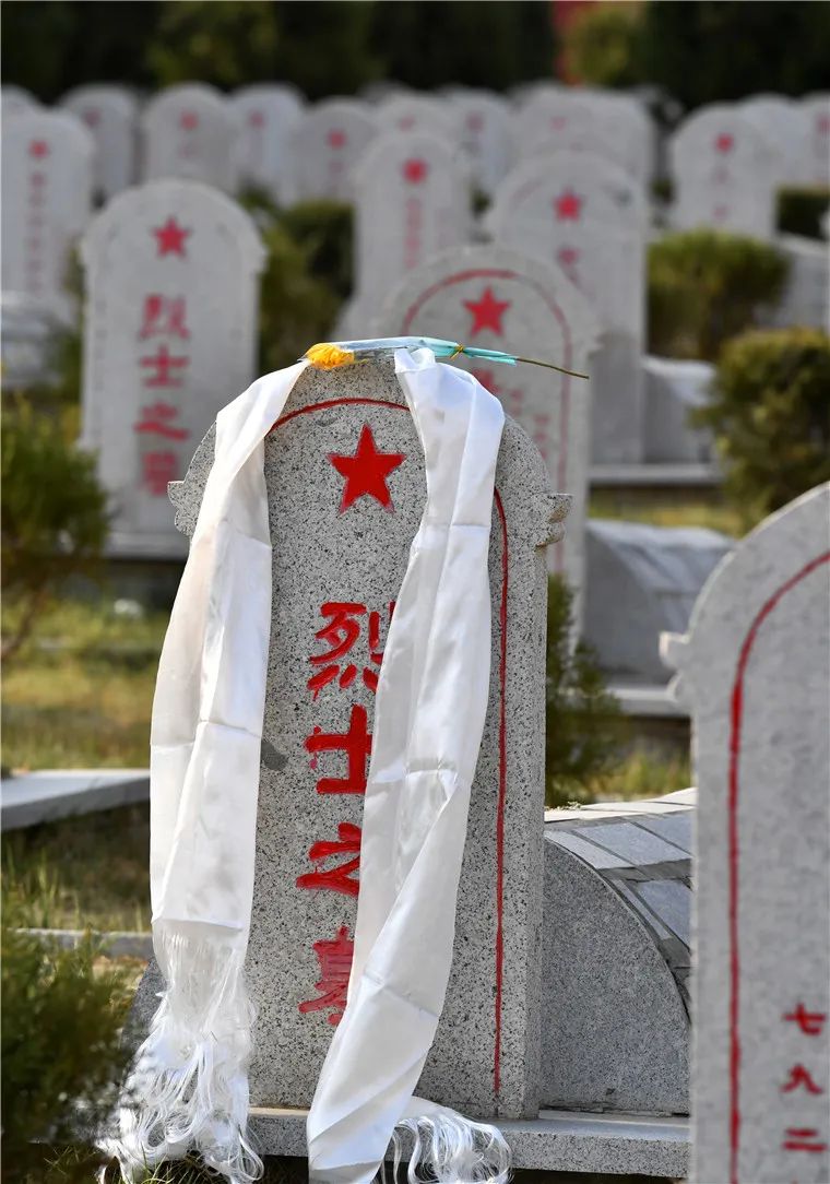 在西藏拉萨烈士陵园,一条洁白的哈达挂在烈士墓碑上(4月4日摄)。