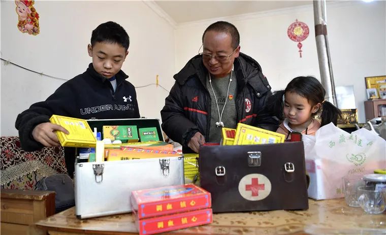秋加(中)和他的孩子在整理药箱(1月14日摄)。