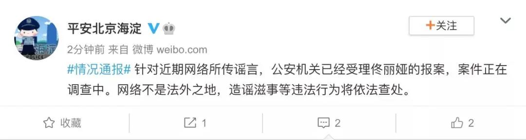 16)据@平安北京海淀 22日消息,针对近期网络所传谣言,公安机关已经受理佟丽娅的报案,案件正在调查中。网络不是法外之地,造谣滋事等违法行为将依法查处。