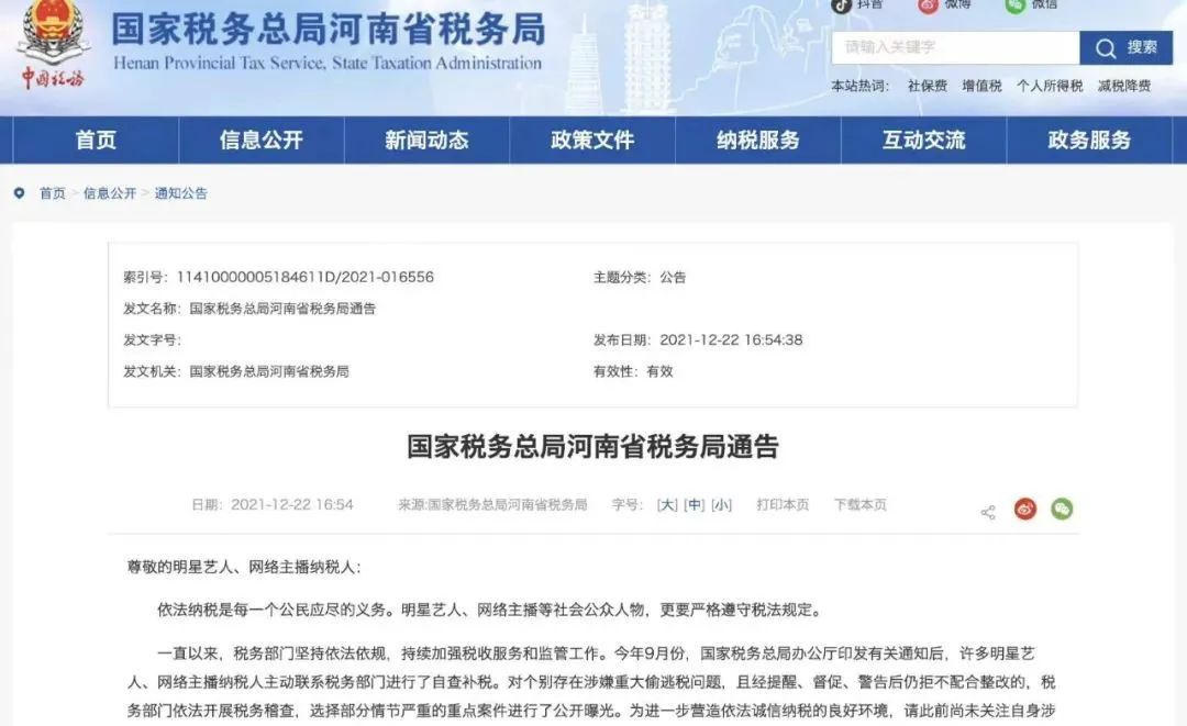 11)河南省税务局22日发布通告:请明星艺人、网络主播抓紧进行自查、补税。