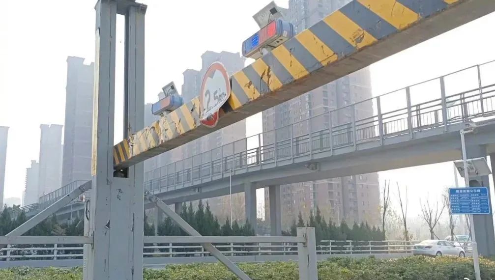 4)郑州西三环北向南方向快车道,有2处被市民戏称“最惨”的限高架,这2处限高架都有大大小小的剐蹭痕迹,就连中间安装的2.5米限高提示圆盘也被撞弯。