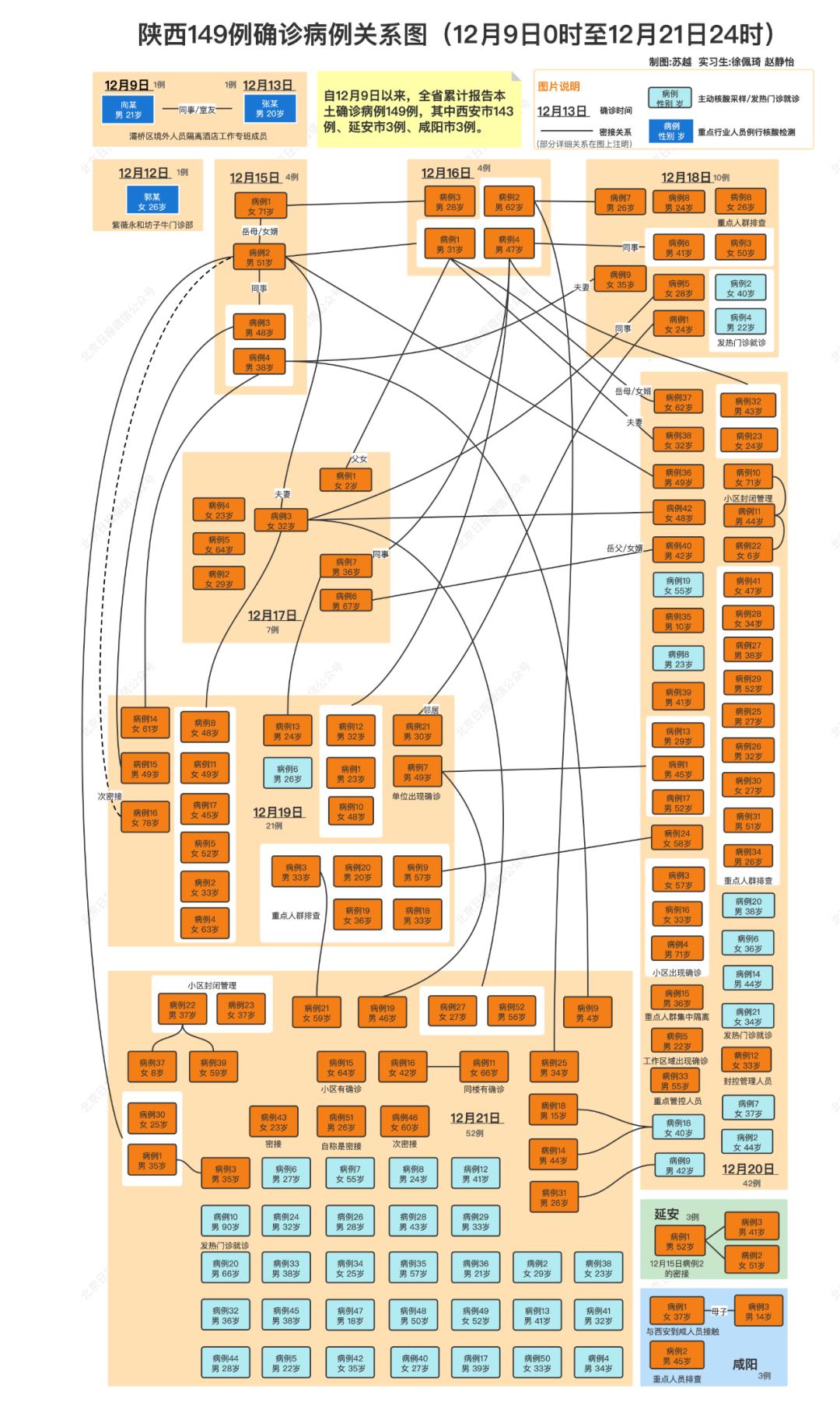 自12月9日0时至12月21日24时,陕西省累计报告本土确诊病例149例,其中西安市143例、延安市3例、咸阳市3例。同时,相关病例还外溢到广东东莞、北京通州、河南沈丘。相关情况,一图看懂↓↓↓