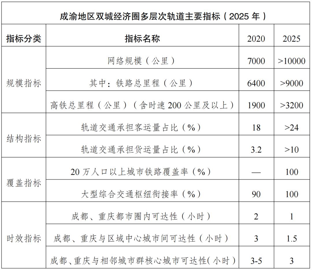 到2025年,初步建成轨道上的成渝地区双城经济圈,进出川渝四向通道基本形成。轨道交通总规模达到1万公里以上,其中铁路网规模达到9000公里以上、覆盖全部20万以上人口城市,形成重庆、成都都市圈1小时通勤圈,实现重庆、成都“双核”间1小时通达,“双核”与成渝地区区域中心、主要节点城市1.5小时通达,与主要相邻城市群核心城市约3小时通达。