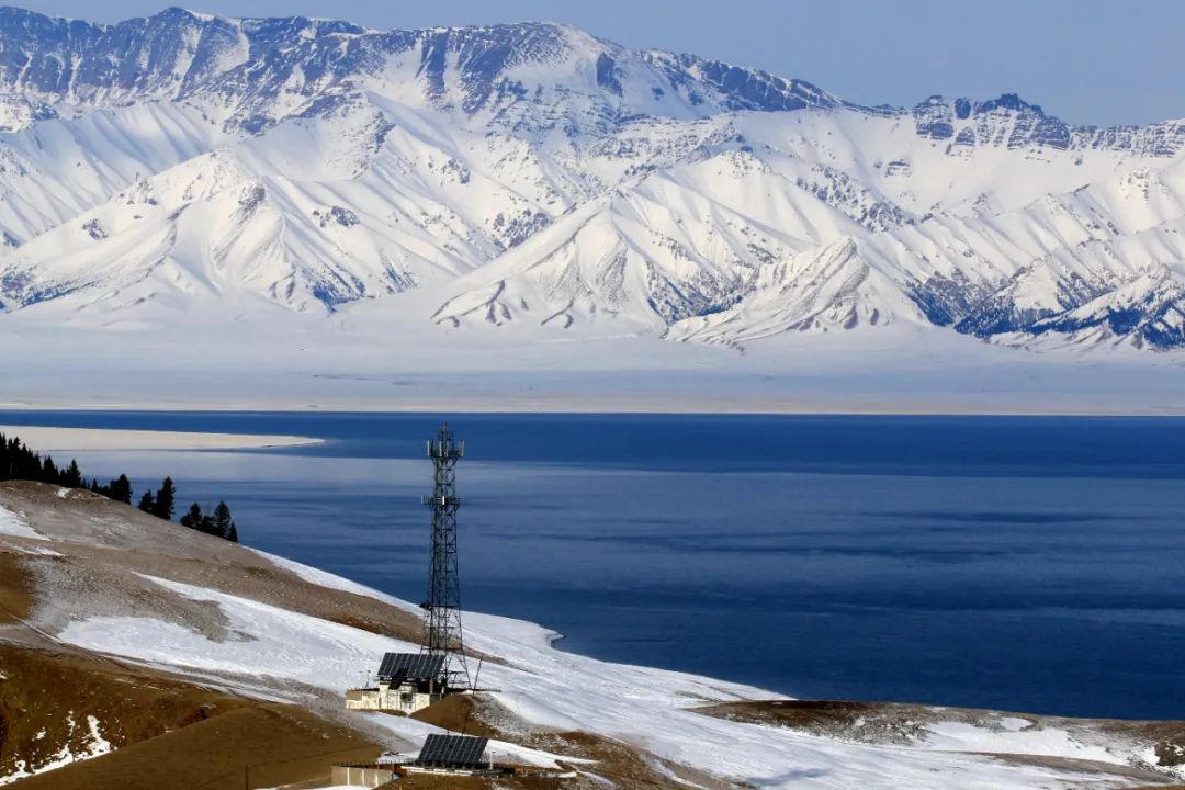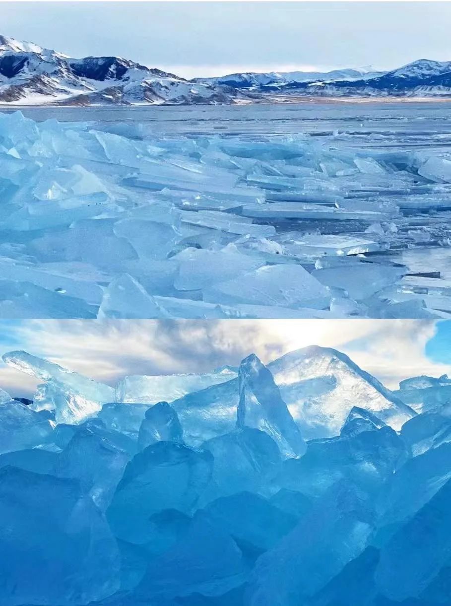 远处,高山白雪常年不化,作背景板;近处,湖水湛蓝、冰块耀眼,既有青海湖的大气浪漫,又不失西藏纳木错的庄严神圣。