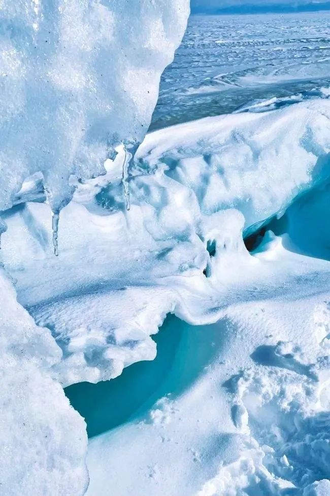 风把很多早期碎裂的冰块推向岸边,堆积成了形态各异的蓝色冰堆,直至三月天气渐暖气温上升,冰面融化,都能看到这片绝美的蓝冰盛景。