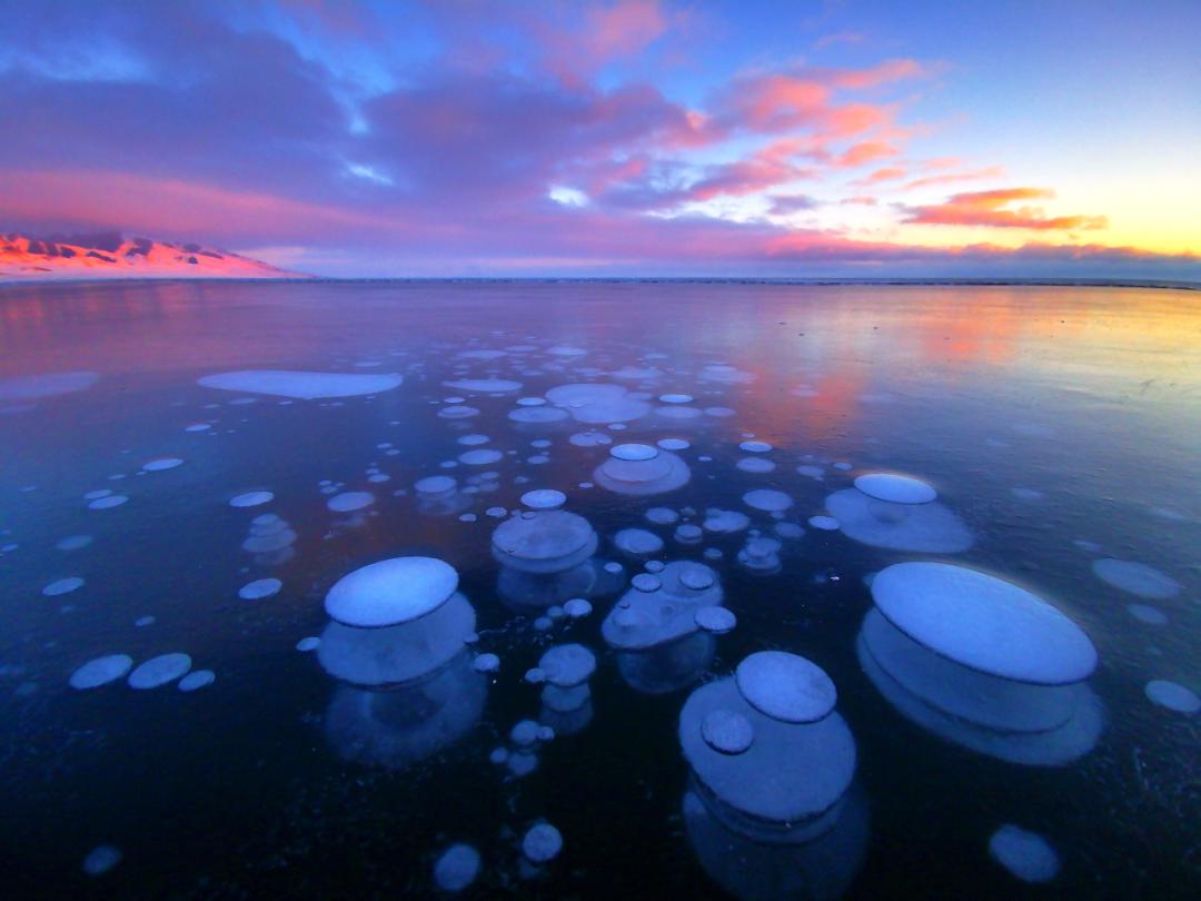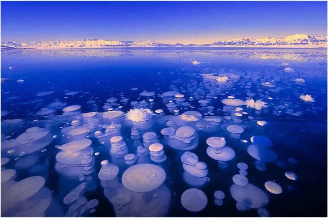 厚厚的蓝冰之下“封印”着的团团白色气泡。冰面如镜面般倒映着群山和霞光,“冰泡”在湖冰中显得格外灵动。