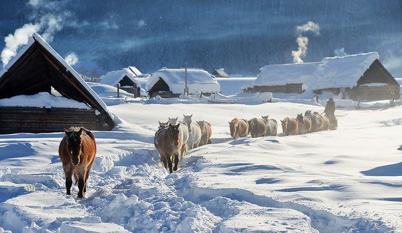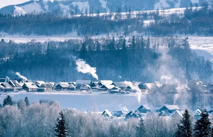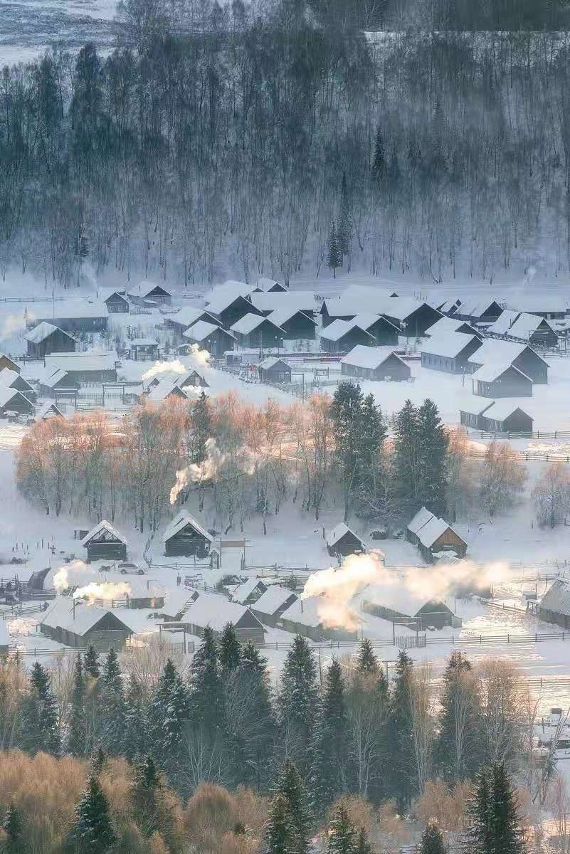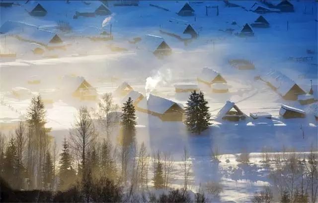 冬日清晨的禾木村,晨雾弥漫、炊烟袅袅。望着被白雪覆盖的整个村庄,可以体会到城市生活中永远无法感受到的宁静、平和。