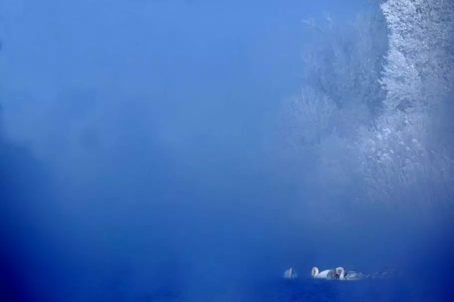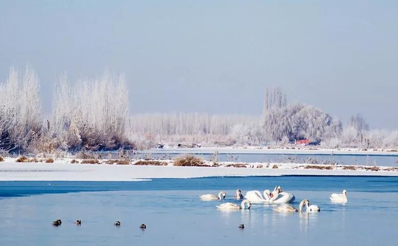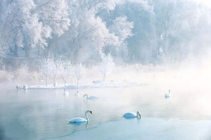 独特的气候环境和水汽,使得天鹅泉常常能看到树挂,晨雾中的天鹅,与雾凇融合在一起,简直美如仙境。