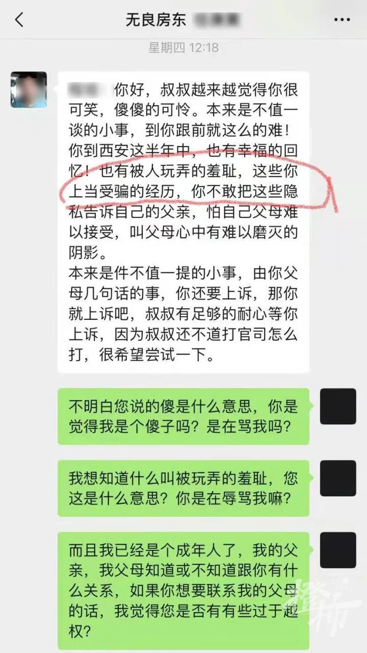 程师傅说,从微信记录里,发现房东任某多次侮辱女儿小程,比如“婊子”“被人玩弄的羞耻”等语句。