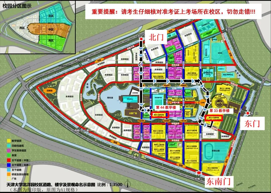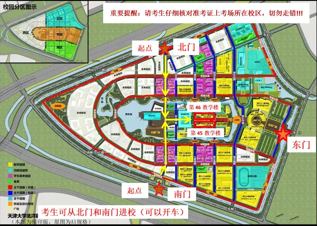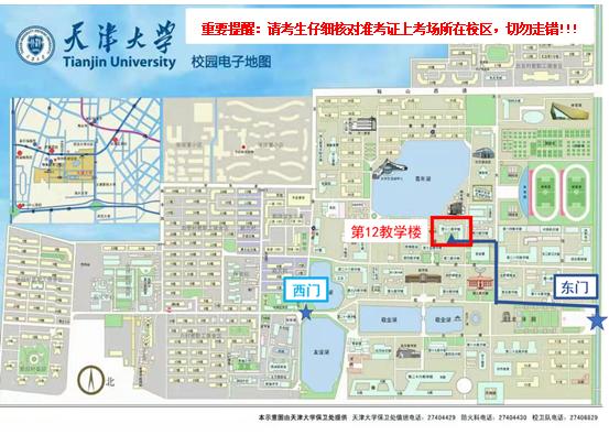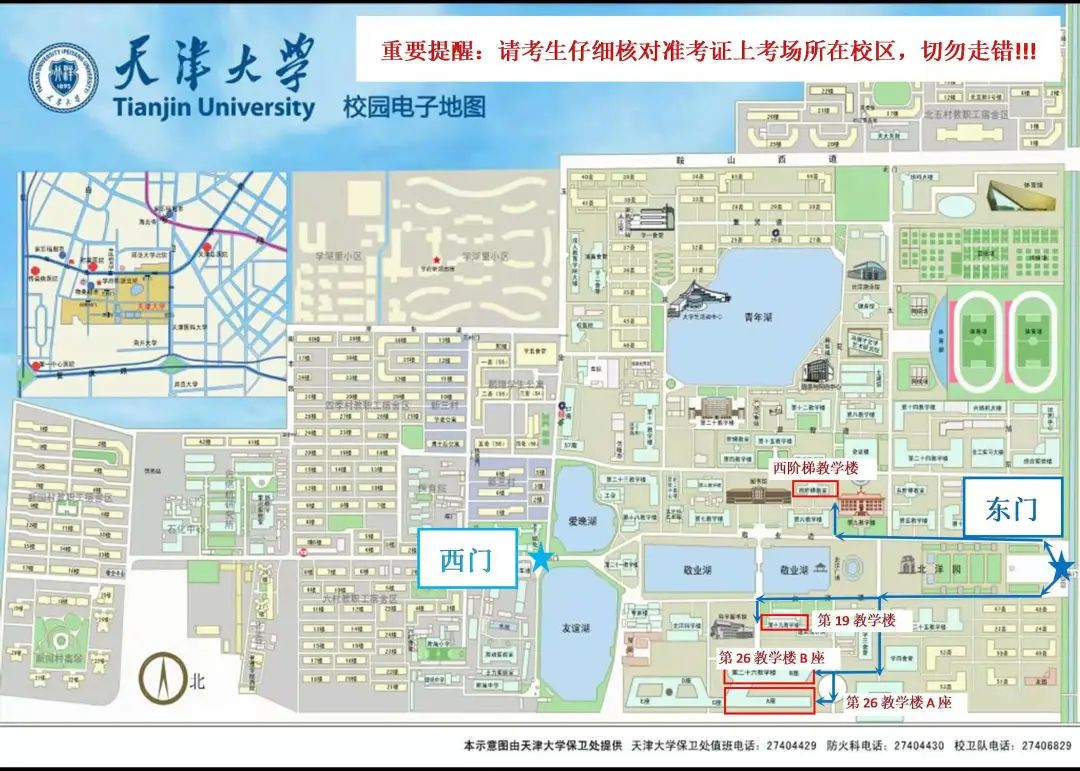 北洋园校区:由北门或南门步行至各考场楼最远需用时25分钟,请考生安排好时间,尽早提前到校。