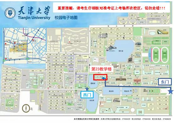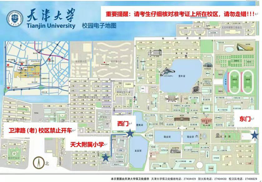 卫津路校区:由东门步行至各考场楼最远需用时15分钟,请考生安排好时间,尽早提前到校。