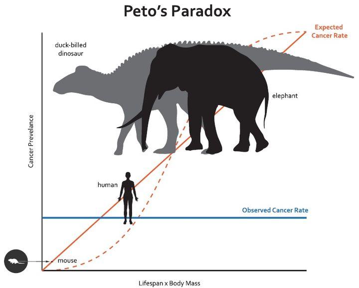 这种明显的矛盾是由流行病学家Richard Peto首先提出的。他研究了人类和小鼠的癌症发病率,发现这两个物种的癌症发病率大致相当。鉴于人类的细胞数量大约是老鼠的1000倍,寿命是小鼠的30倍,这就产生了一个难题。更令人惊讶的是,观察到大型和长寿的野生动物似乎没有显示出明显更大的癌症倾向。