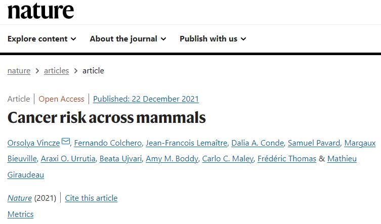 导读:体型大且寿命长的动物就更加容易患肿瘤,然而实际上并非如此。12月22日,研究人员在《Nature》上发表的研究,提供了迄今为止对佩托悖论最深入的评估,证明癌症死亡风险在很大程度上与物种的体重和成人预期寿命无关。在物种中,更大的体型和更长的寿命的进化一直伴随着强大的抗癌机制的共同进化。一个关键的决定因素似乎是饮食,肉食性哺乳动物面临最高的癌症相关死亡率。大型动物自然选择的抗癌机制是显著降低它们致癌风险的原因。这些不同的机制已经成为深入研究的焦点,因为它们有可能在野生动物和人类中预防这种致命的疾病。