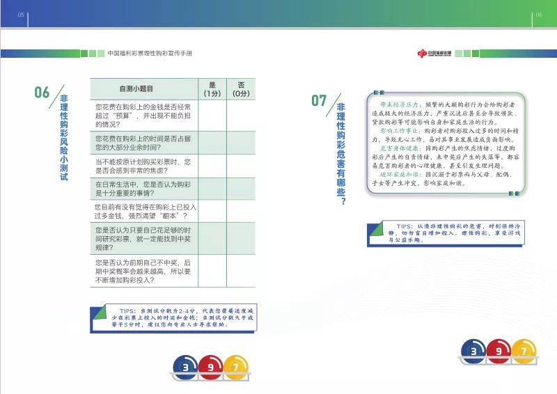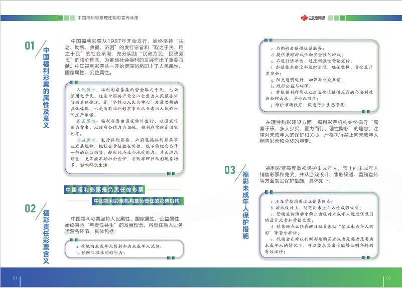 《手册》涵盖福利彩票的属性及意义、福彩责任彩票含义、福彩未成年人保护措施、福彩游戏种类、非理性购彩心理、非理性购彩风险小测试、非理性购彩危害等7方面的内容,全面系统介绍了福利彩票坚持人民属性、国家属性、公益属性,始终秉承社会责任优先的理念、将社会责任融入业务运营各环节的有益实践,积极倡导“寓募于乐、多人少买、量力而行、理性购彩”的购彩理念。