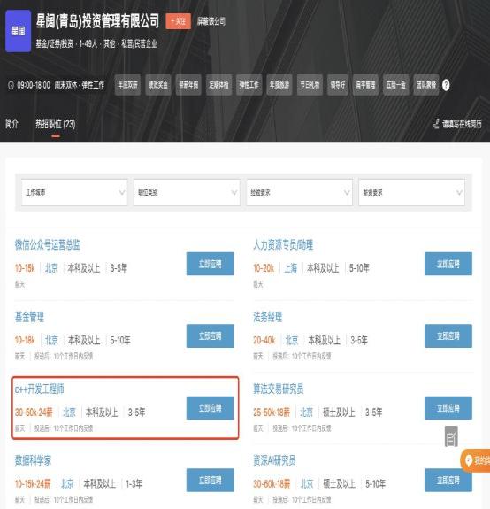 星阔投资表示,未来希望可以持续壮大投研队伍,不断拓宽数据来源,以提升算力水平。招聘网站显示,目前星阔在招职位23个,其中资深AI研究员的月薪区间为35-55k,同时实行24薪,这也就是说该岗位的年薪可达132万元。除此之外,c++开发工程师、数据科学家、产品运营、基金交易员等多个岗位都是实行24薪制。