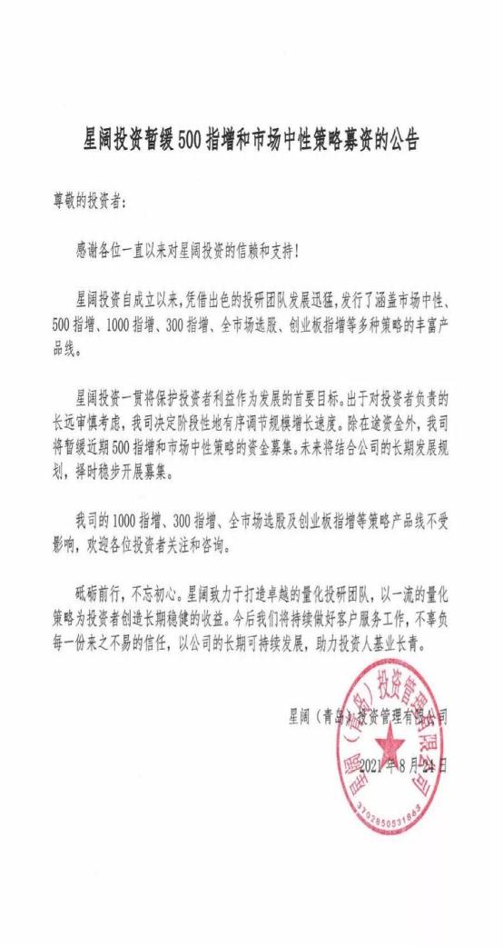 此外值得注意的是,星阔投资曾于8月24日发布暂缓500指增和市场中性策略募资的公告。星阔投资表示,出于对投资者负责的长远审慎考虑,决定阶段性地有序调节规模增长速度。除在途资金外,将暂缓近期500指增和市场中性策略的资金募集。未来将结合公司的长期发展规划,择时稳步开展募集。