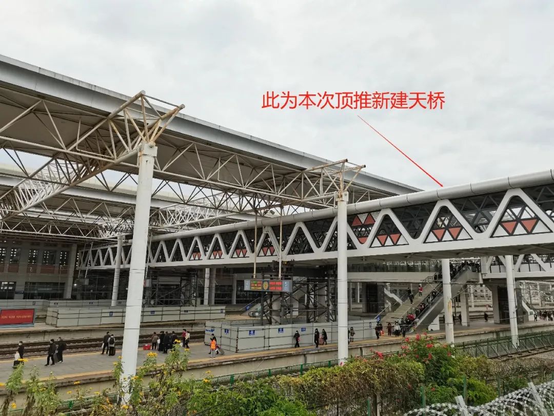 莆田站新建天桥总长112.2米,宽6.9米,重约401吨,跨既有莆田站内所有轨道线。本次为新建天桥第四次顶推作业,标志着莆田站重点控制工程取得关键性进展,对莆田站建设推进具有重要的意义。