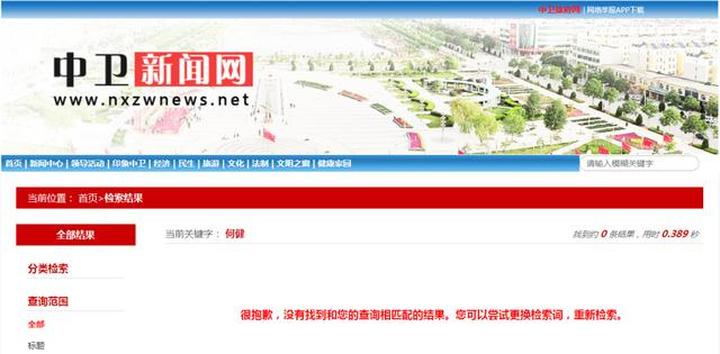 当天,有媒体在“中卫新闻网”中搜索“何健”,页面显示“没有找到和您的查询相匹配的结果”。同时,在中卫市政府官网中,也未见“何健”相关新闻报道。