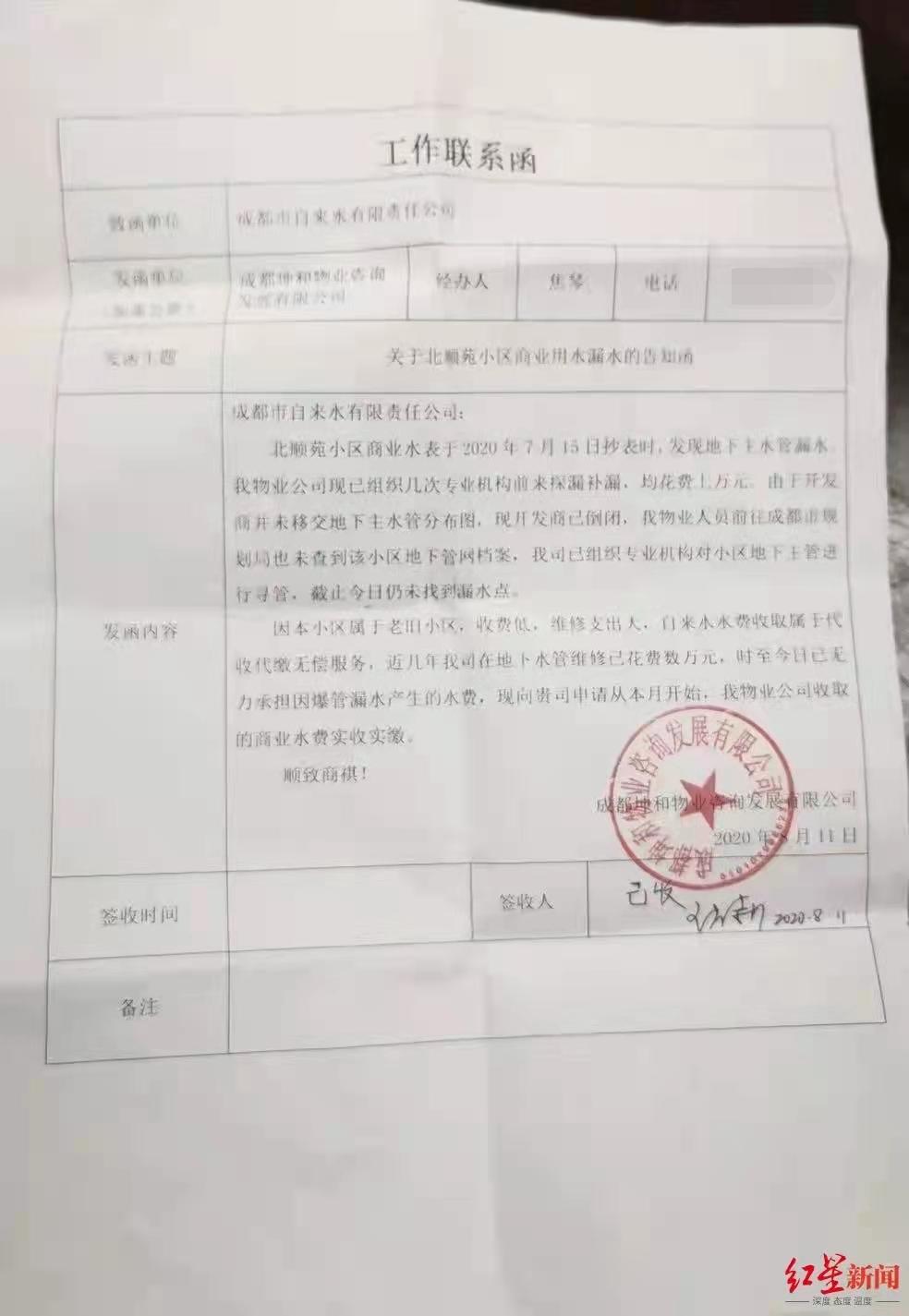 红星新闻记者获得了这份物业和业主所称的函件,该份函件于去年8月11日发给自来水公司。其中提到,最早发现地下主水管漏水的时间为2020年7月15日,因未查到管网档案,物业几次组织专业机构探漏均未成功,同时,近几年物业公司在地下水管维护已花费数万,“时至今日已无力承担因爆管漏水产生的水费”。函件同时提到,此前水费收取为物业代收代缴无偿服务,自当年8月起,物业公司收取的商业水费将“实收实缴”。