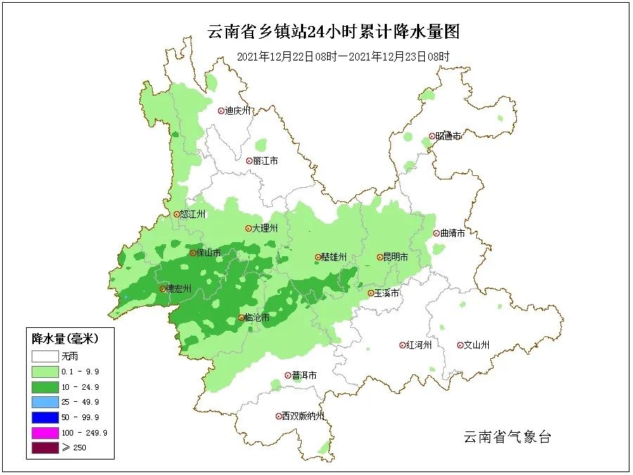 12月25日夜间:昭通、曲靖东部和北部阴有小雪或雨夹雪,曲靖西部和南部、文山、红河、昆明、玉溪、普洱东部、西双版纳东部多云间阴有小到中雨局部大雨,楚雄、普洱西部、西双版纳西部、临沧多云有阵雨,其他地区晴间多云。