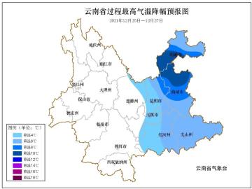 12月26日:昭通、曲靖东部和北部阴有小雪或雨夹雪,高海拔地区有中到大雪,曲靖西部和南部、文山、红河、昆明、楚雄、丽江东部、玉溪、普洱、西双版纳阴有小到中雨局部大雨,迪庆、怒江、丽江西部多云有阵雨,其中迪庆北部、怒江北部高海拔地区有阵雪,其他地区多云间晴局部有阵雨。