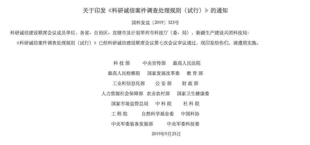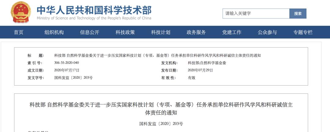 2020年,科技部、自然科学基金委下发通知,进一步压实国家科技计划任务承担单位的主体责任,其中明确,严格把好学术关、诚信关,确保发表的论文严谨规范、数据真实;对严重违背科研诚信、科研伦理等要求的,要严肃查处。