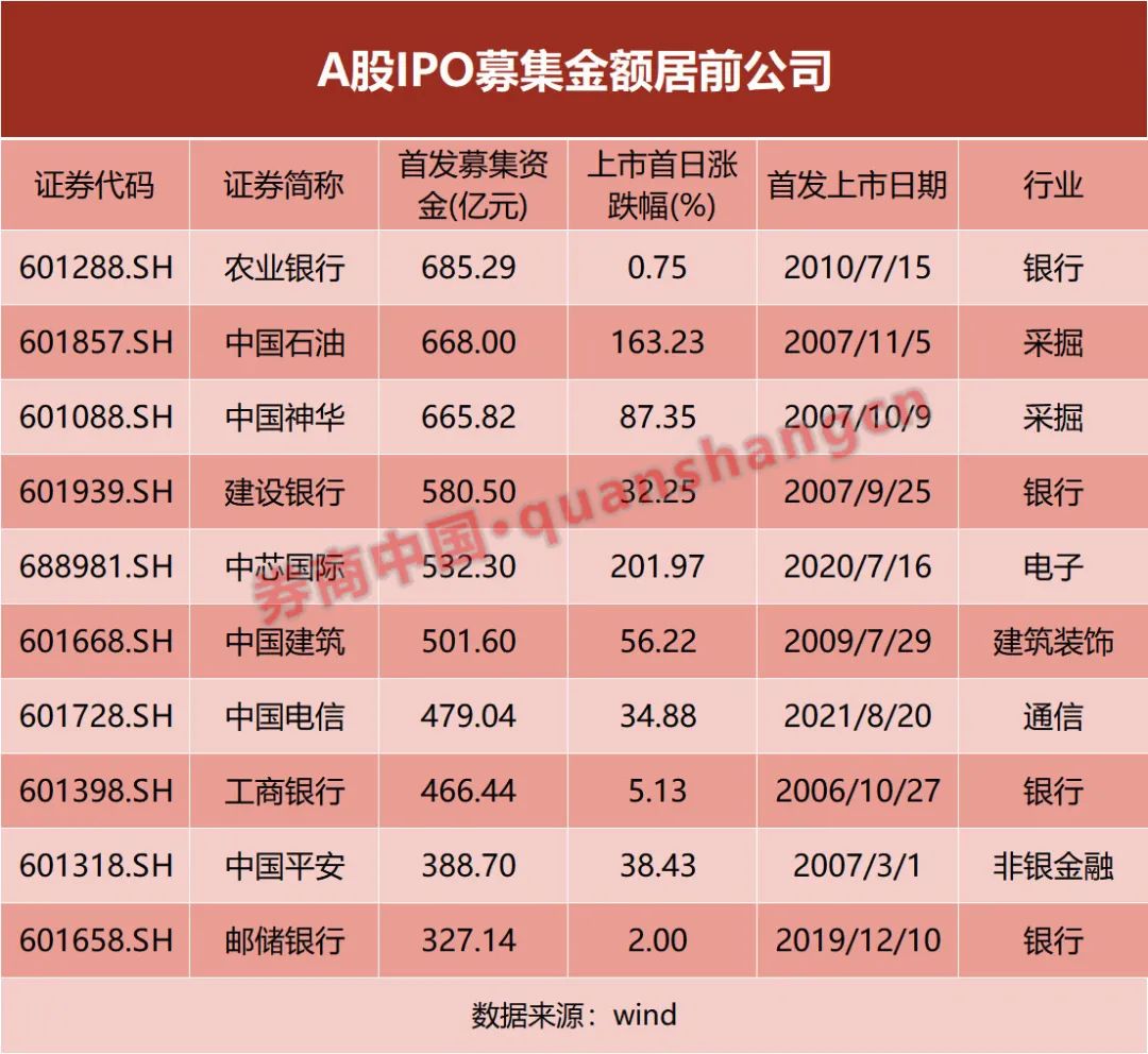此前,中国移动确定A股发行价格为57.58元/股,拟登陆沪市主板,拟发行9.56亿股票,拟募资560亿元,该金额超过了中芯国际去年532.3亿元的募资额,位列A股IPO募集金额第五,在农业银行、中国石油、中国神华和建设银行之后,是A股11年以来最大IPO。