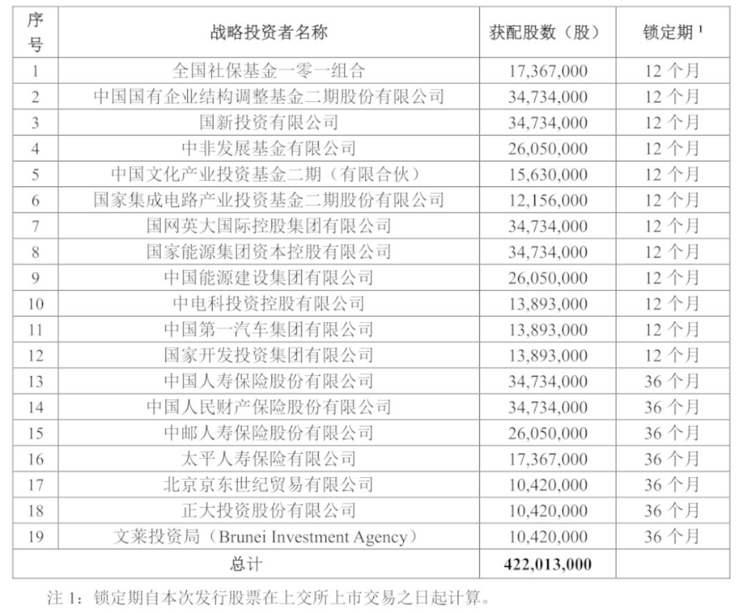 同时公布的还有19家战略投资者名单和获配股数明细,国调基金二期、社保基金、大基金二期、正大投资和文莱投资局等在列,本次发行最终战略配售数量为 4.22亿股,约占绿鞋行使前本次发行总量的49.9%,约占绿鞋全额行使后本次发行总量的 43.39%,合计认购金额高达243亿元。