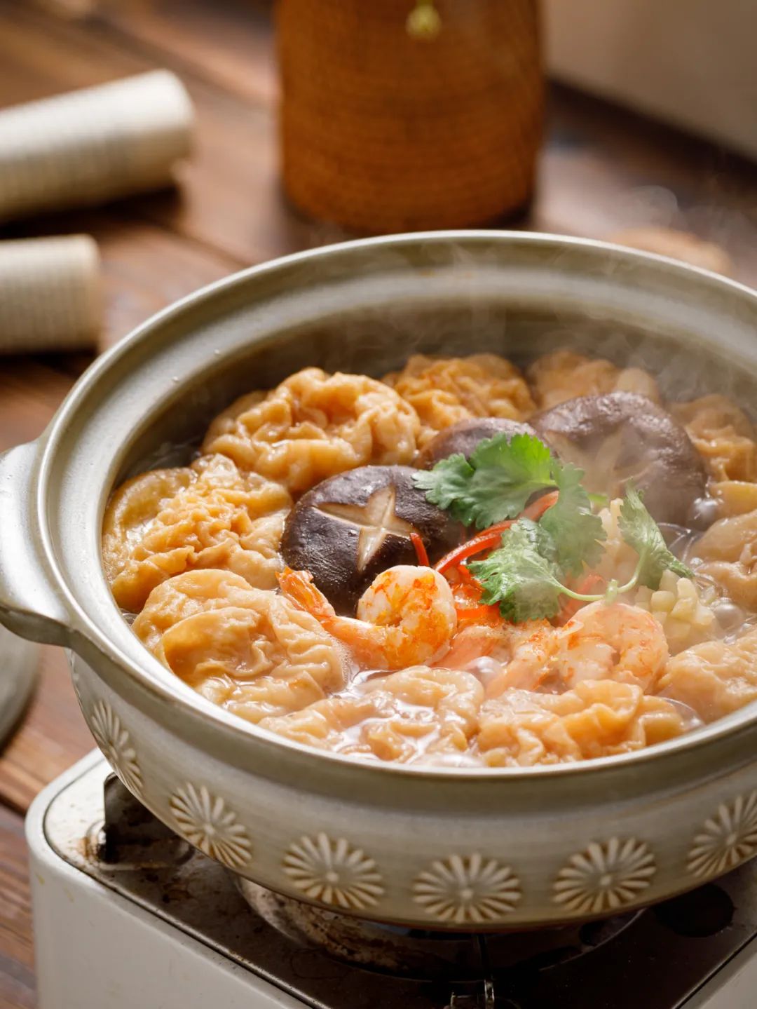 娃娃菜铺地,放上粉丝,以及虾、鱿鱼花、鱼腐、香菇,淋上汤汁,大火煮开后,盖上盖子,转小火焖煮10分钟,撒上红椒丝和香菜段做装饰,就完成了!