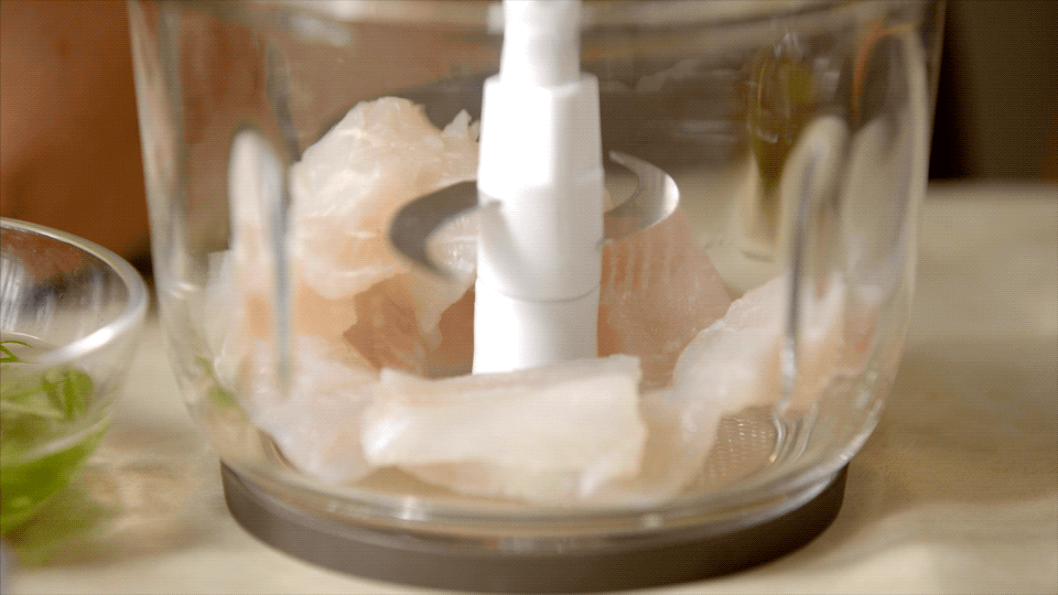 巴沙鱼切块后放入搅拌机内,加入盐、糖、葱姜水打成细腻的鱼蓉,分2-3次加入蛋清继续搅打细腻。