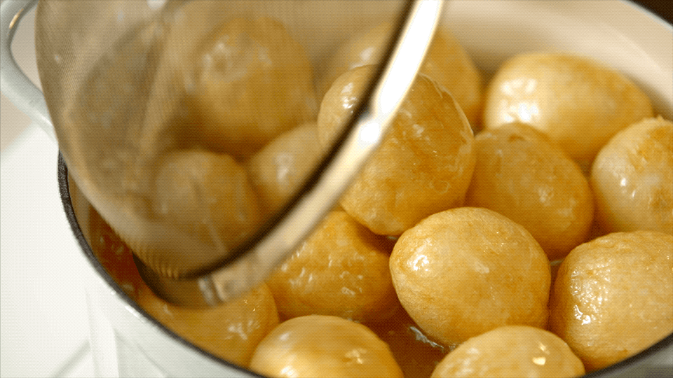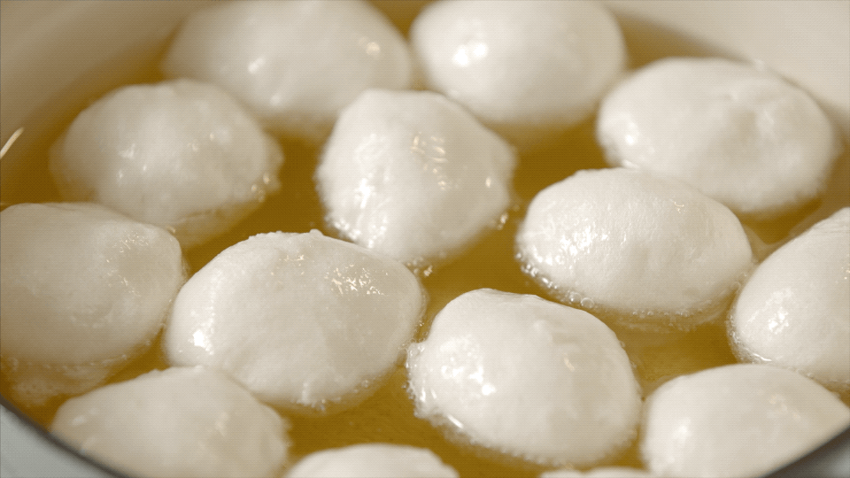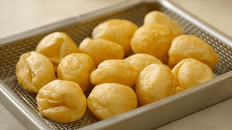 出锅后,鱼腐接触空气后会缓慢收缩变成扁扁的金球,皮薄有皱褶,外表似蚕纱,绉纱的名字就是这样来的哦~