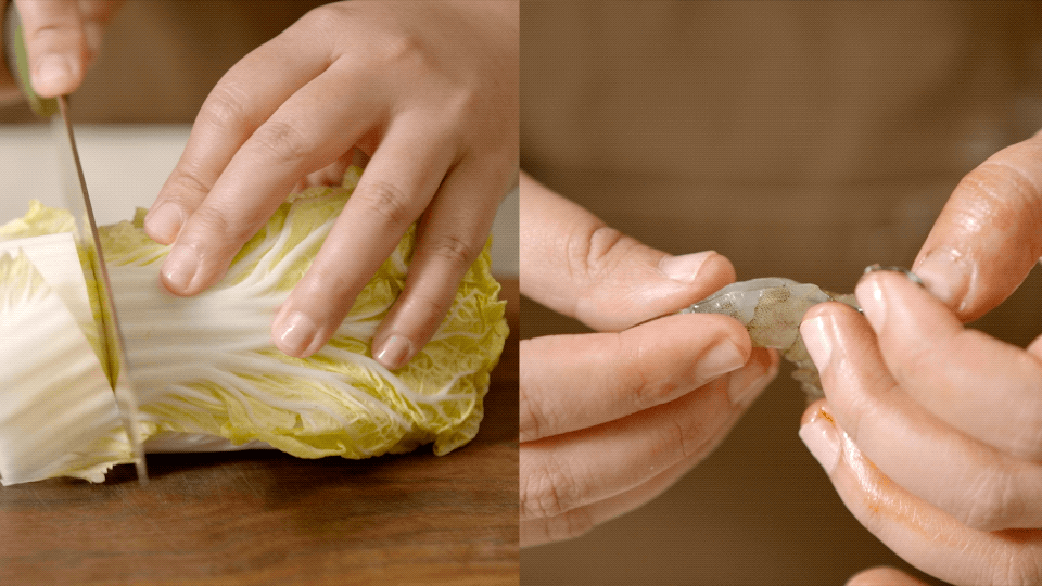 鱼腐准备好就开始做绉纱鱼腐鲜虾锅啦!将娃娃菜切开,虾去壳、去虾线。