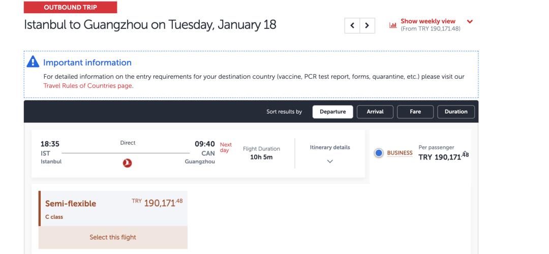 同时,红星新闻记者查询土耳其航空官网了解到,最近一班从伊斯坦布尔飞抵境内的航班是在2022年1月18日,已经没有经济舱而只有商务舱,其价格虽然远低于20万人民币的“天价”,但仍然高达190171土耳其里拉(折合人民币76205元)。同样日期的机票,在国内第三方平台售价则高达95779元。