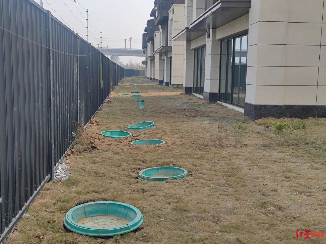 在别墅区域,记者注意到,小区的“围墙”采用铁栏杆打围,栏杆外是绿化草坪。在栏杆以内的花园区域,屋前屋后、双拼别墅楼栋之间,有不少绿色塑料井盖,或盖在井口,或放置一旁。