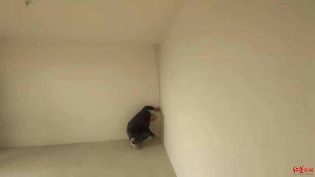 同时,房间墙面有不同大小的修补痕迹,甚至有房间受潮生霉,而该项目尚未交房,水电暂未接通。业主现场演示,不少墙面用手就能按出凹坑,敲击墙面能听到空鼓的声音。