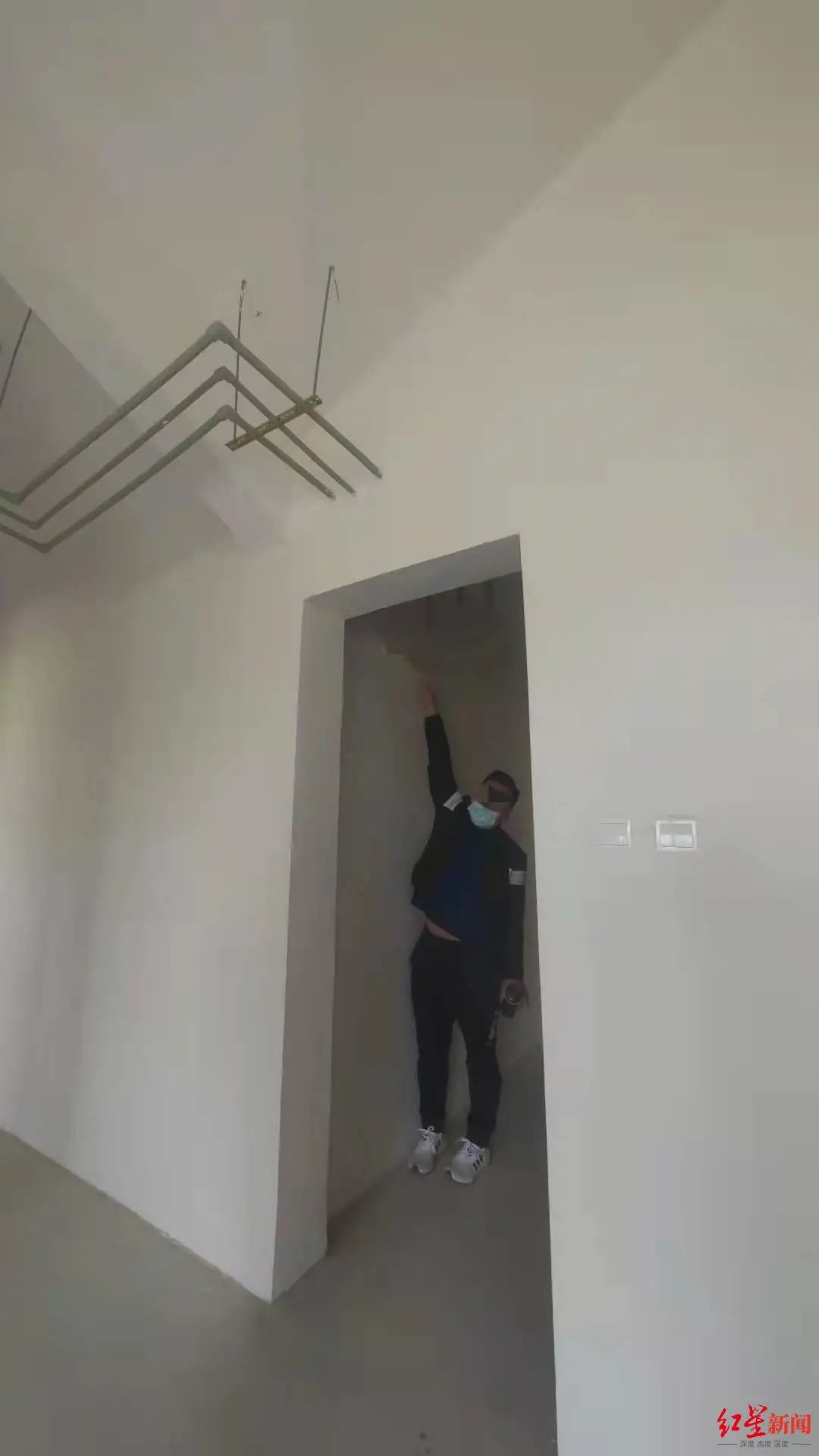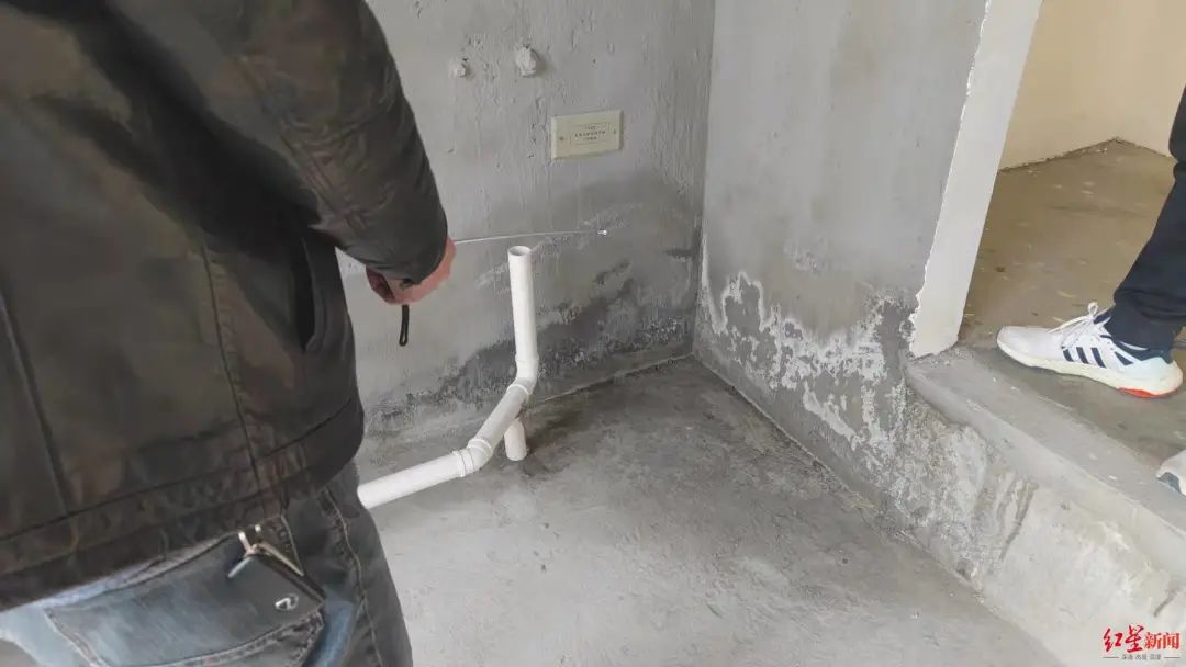 在二楼、三楼房间,记者看到不少裸露的管道。据业主介绍,这些都是冷热水管,根据合同约定应为暗埋,但据他们所知,设计方案就是明管。