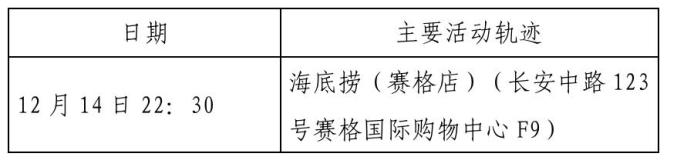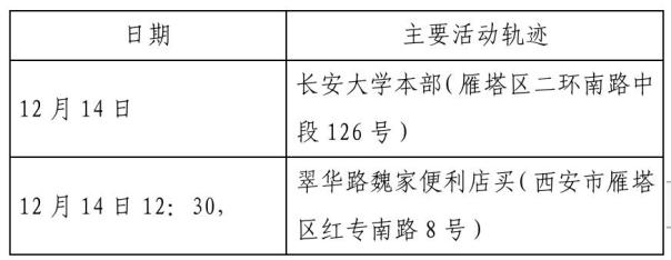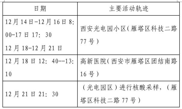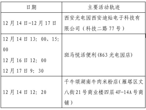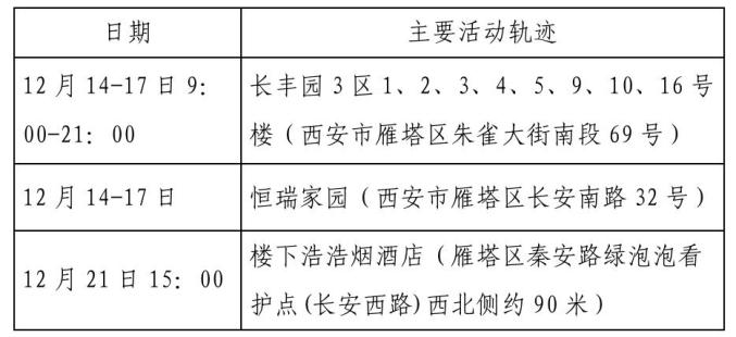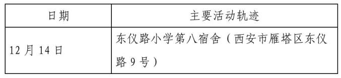 确诊病例14,现居西安市雁塔区,系12月22日发布的确诊病例23的密切接触者。隔离期间12月21日核酸检测结果阳性,轻型。无公共场所活动轨迹。