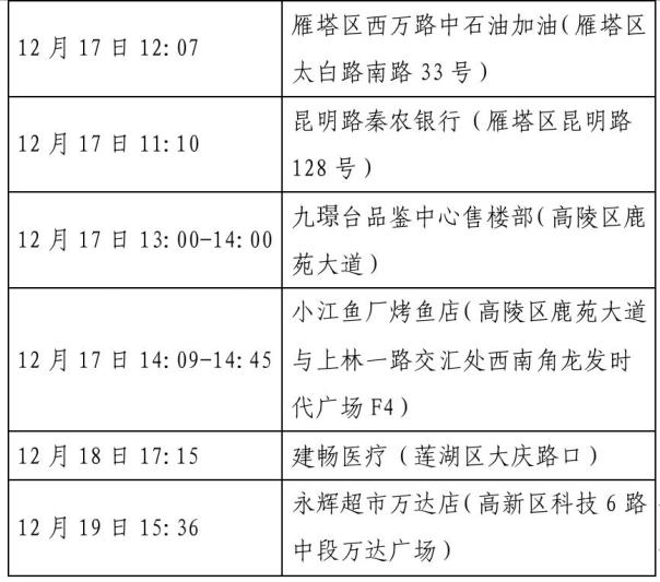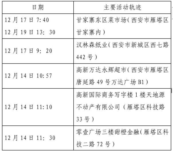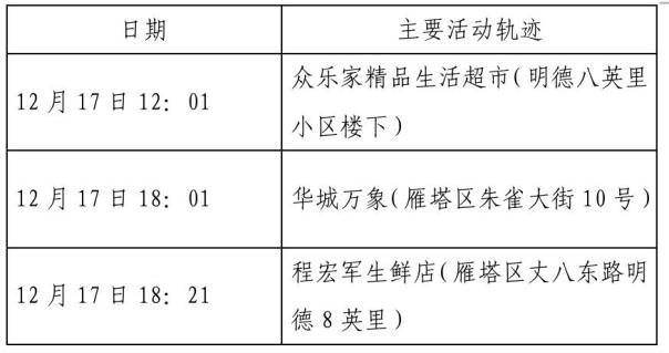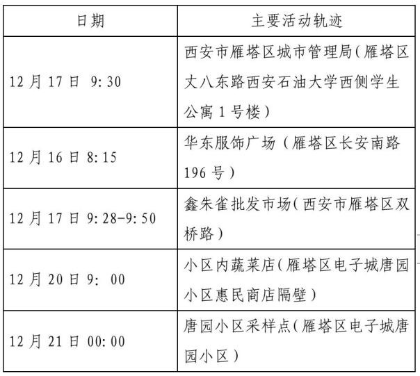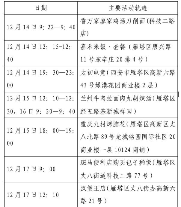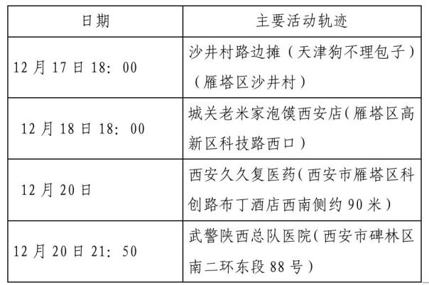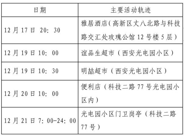 确诊病例17,现居西安市雁塔区,系12月21日发布的确诊病例22的密切接触者,12月19日被集中隔离,普通型。无公共场所活动轨迹。
