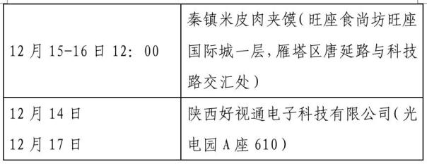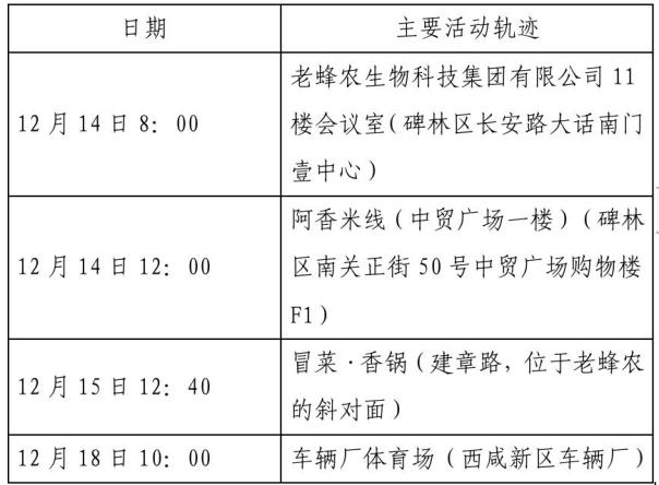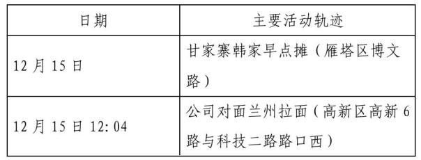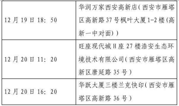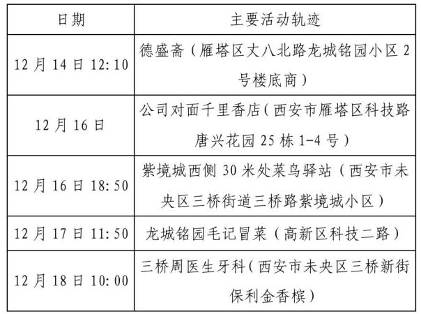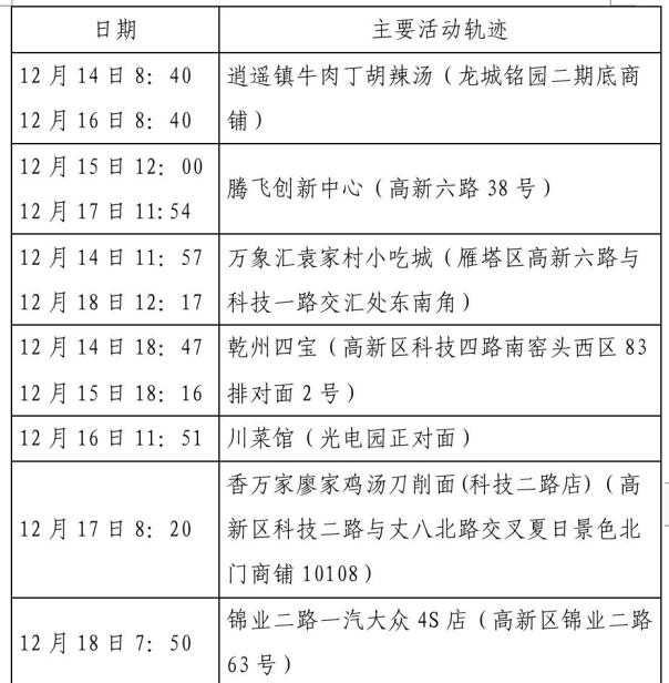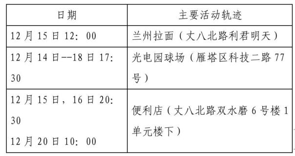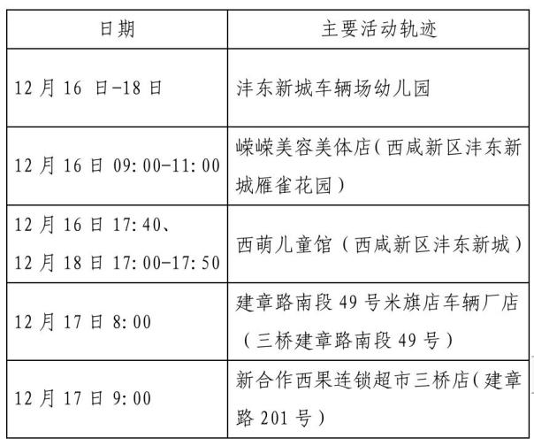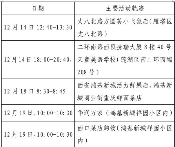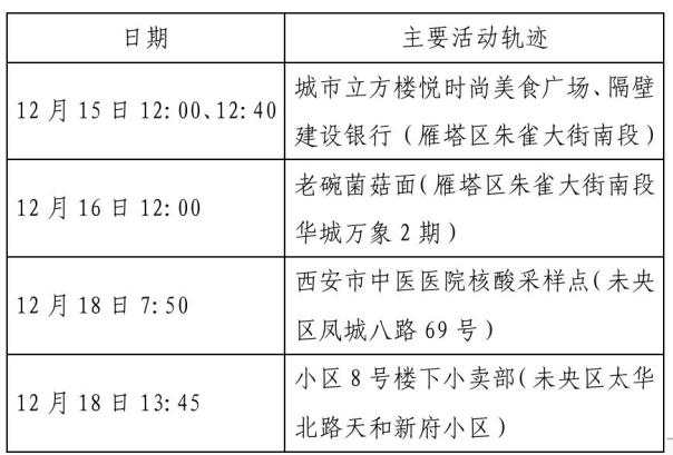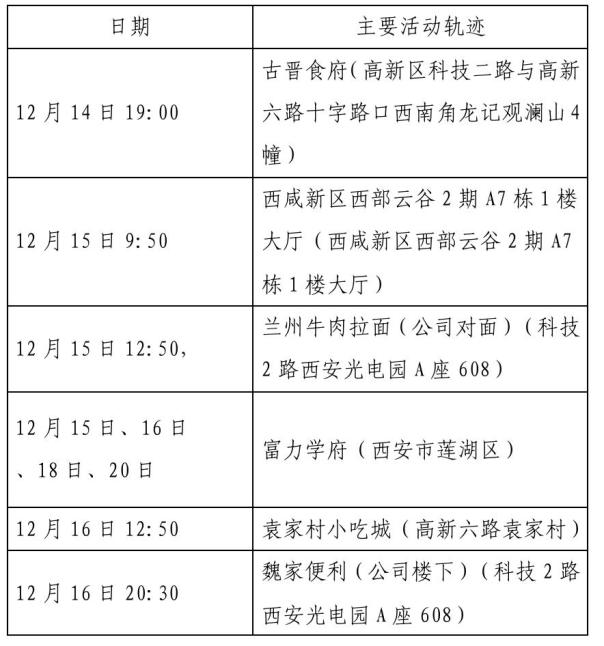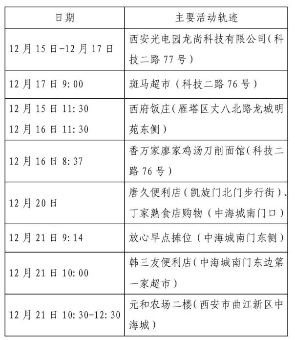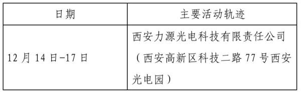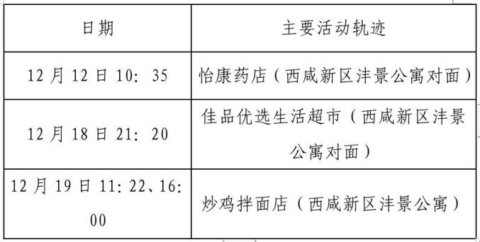 确诊病例12,现居西安市西咸新区,系12月22日发布的确诊病例4的密切接触者。12月20日被集中隔离医学观察,普通型。无公共场所活动轨迹。