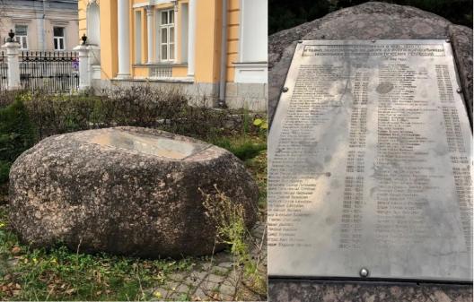 为寻访包其三的人生“终点”,我在初冬的一天下午来到了位于莫斯科市什维瓦雅山丘之上的尤兹卡娅医院,现在它叫第二十三临床医院。从1918年开始,该医院划归“格别乌”所有。那时,这里不仅给契卡人员治病,还承担秘密处决犯人的任务。据统计,1921至1926年,这里共处决、埋葬了九百六十九人。进入庭院,我看到一座1999年竖立的“政治迫害者”纪念石。纪念牌匾上按字母顺序刻有一百零三名受害者的姓名,Пау-Ти-Сан——包其三的名字赫然出现在第二列第十八位。