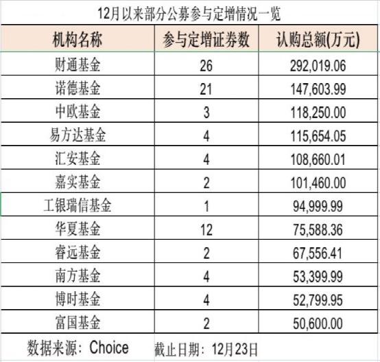 从基金管理人的角度看,Choice数据显示,按增发公告日计算,截至12月23日,69家基金公司今年以来参与上市公司定增,合计认购总额1219.95亿元,超过去年全年。其中,12月以来,有27家基金公司获配上市公司定增,合计认购金额高达163.32亿元。