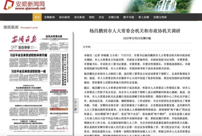 上述报道显示,贵州省毕节市委原副书记、市长杨昌鹏,已任安顺市委书记。